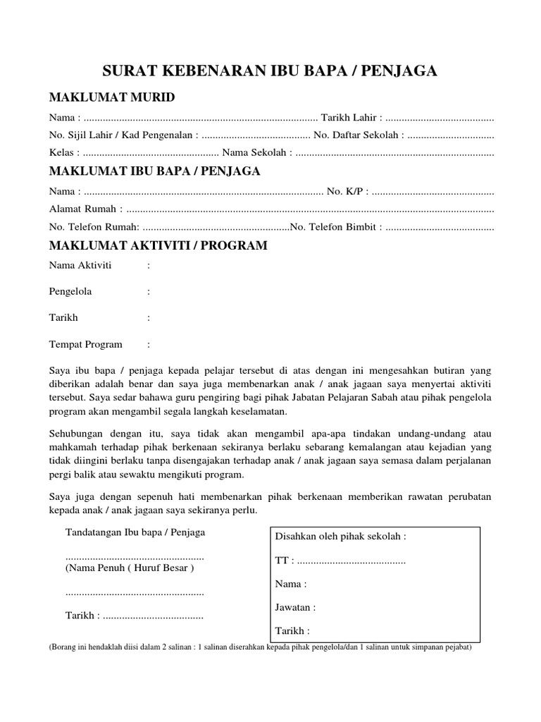 Contoh Surat Kebenaran Ibu Bapa Untuk Program